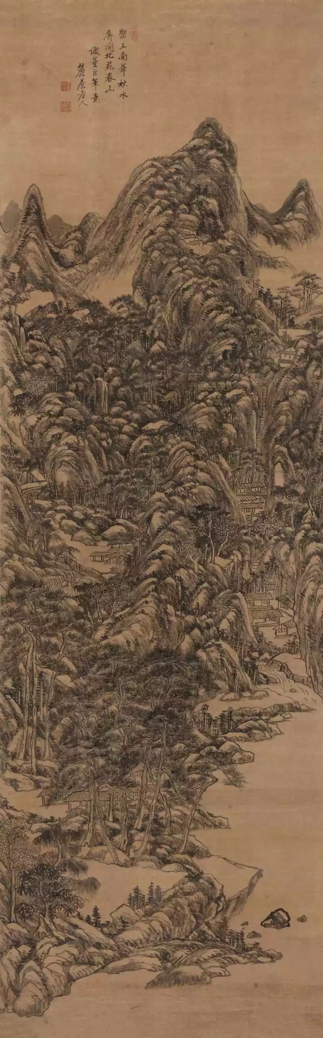 此幀《仿董巨苑山水》以高遠構圖,是畫家心目中的理想仙境。繪高山屹立之下,重巒疊嶂,流泉飛瀑,雜木叢生、洲渚房屋掩映的山光水色之景,于雄奇中內具空靈之貌。山石的頂端多留有空白,干筆皴擦,淡墨暈染,山頂重墨點苔。密集的簇點,且加入墨線來加強山的體勢,線、點、皺的融合更為強烈。虛處筆跡似有似無,表現出嵐光浮動的清幽意境。整幅作品具有淡而厚、實而清的書卷之氣筆墨蒼潤老辣,于粗放中物象畢現,率意中氣韻盎然。畫作飽滿的構圖、雄渾的氣勢、深幽的意境以及山石的皴法都源于董巨,而生拙的用筆和多層皴染的畫法則流露出作者“熟不甜,生不澀,淡而厚,實而清”的自家面貌,得山巒于風骨奇峭中包孕秀爽清潤之美。王原祁在提倡“仿古”的同時,還強調擺脫古法的羈絆,成自家風格,在“仿古中求脫古”。他曾說:“畫道與文章相通,仿古中又須脫古,方見一家筆墨,畫雖小苑,所以可觀也。”此軸便是其“仿古脫古”的典型代表作。