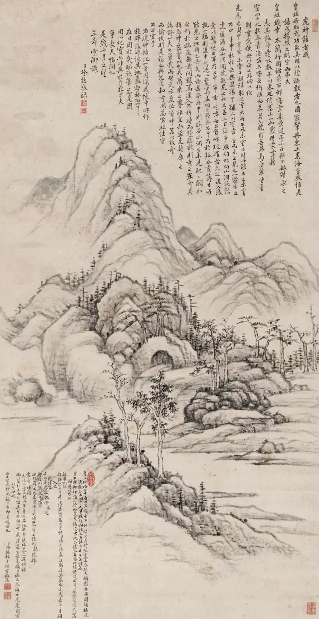 徐揚《摹乾隆帝御筆虎神鎗記圖》,為其背摹皇帝之作。乾隆皇帝原作為《御筆虎神鎗記圖》,《石渠寶笈》有記。乾隆皇帝《御筆虎神鎗記圖》作于乾隆十七年(1752),是年皇帝領文武百官于木蘭圍場例行秋獼,于眾人前在如此之遠距離射殺猛虎,故而意氣風發(fā),得意非常。先做文以記之,并此地立碑(尚存,圍場新撥鄉(xiāng)月亮溝西山坡上),自題碑文《虎神槍》記,同時又用御筆寫下了“乾隆十七年秋獼,上用虎神槍殪伏虎于此洞”十八字,刻于虎洞之上之石崖。而后又做《御筆虎神鎗記圖》,記其事,“且追憶其山川為之圖”。雖然乾隆皇帝斯圖未現于世,然比較其所作山水,徐揚《摹乾隆帝御筆虎神鎗記圖》應近似皇帝原作。徐揚此圖規(guī)格尺寸亦仿制原作,純以水墨為之,圖亦應照摹“岳樂圍場景”,寫“虎洞”為重,其用筆簡練平和,曠達悠遠,皴法清雅厚重,自然練達,完全一脈乾隆皇帝山水法度。徐揚在跋中亦言“是歲(1752)嘉平月朔,入值乾清宮。上以是圖是記呼揚近御座而熟視之。且蒙指點山川之風景,圍場之武備,瑯虎之情形。揚跪捧宸章,詳聞天語,不啻目睹其事,身游其地。退食後敬摹一過,并錄御制於上,而自跋其下。非特以千載遭逢之盛,為微臣志不忘;後之見是圖者,亦可知我皇圣武神威,超千古而莫媲者也”。記載其背摹經過,“退食後敬摹一過,并錄御制於上,而自跋其下。非特以千載遭逢之盛,為微臣志不忘;後之見是圖者,亦可知我皇圣武神威,超千古而莫媲者也”,以彰顯“十全老人”之文治武功,非常人所能及之萬一也。