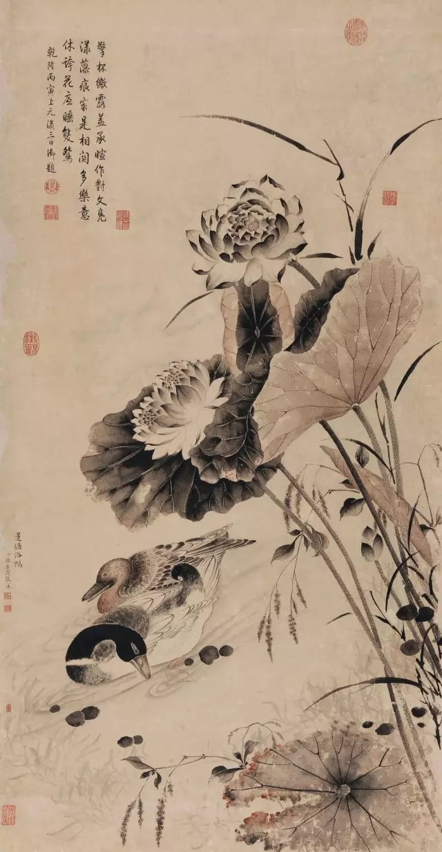 張若靄祖父張英,父親張廷玉,皆為康熙、雍正、乾隆朝大學士。其為張廷玉長子,其弟為張若澄,可謂是一門重臣。張若靄是皇帝親授內閣大學士,雍正十一年(1723),皇帝在殿試審閱試卷時,看到原判為第五名,屬于二甲的文章胸懷氣勢很大,就將其提到一甲第三名,待考卷拆封,才知為張廷玉之子考卷。張廷玉三次懇辭,恐占天下寒士之先,于心實有不安,請列二甲,愿將一甲之榮讓于天下寒士。出身名門的張若靄靠的并不僅僅是祖輩的蔭庇,皇帝青睞也不僅僅是因為他是宰相張廷玉之子。身為近臣的張若靄才華橫溢,曾參與《石渠寶笈》的編纂,后為乾隆皇帝的隨身侍臣。然天妒英才,乾隆十一年(1746)隨帝西巡,因病回京,不久卒,年三十四。張若靄善書,工畫山水、花草蓮竹、禽鳥飛蟲,深得陳淳、王糓祥、周之冕筆意。是圖《蓮塘浴鴨》,寫荷塘一角,蓮花盛開,微風浮動,雙鴨戲水。寫葉以赭墨渲染,雖沉秾而有清艷之快感;莖桿一筆而下,顯示超脫塵俗之風韻;蓮瓣重重,花蕊紛紛,又有好事連連之喻也。荷下雙鴨顧盼生姿,眸中似有無盡歡喜悵然之思。乾隆皇帝御題七言詩一首,贊此圖雖畫雙鴨,卻如老杜所言“自來自去堂前燕,相親相近水中鷗”,鴨、鴛鴦、鷗等等皆為水鳥雙鳧,以雙禽相嬉之狀,言說世間之美好,圖畫之教化也。此作繪于乾隆丙寅(1746),即張若靄卒年,或為張若靄生前絕筆也。是圖原為清宮舊藏,曾收藏在北京市文物局,後落實政策退還藏品。