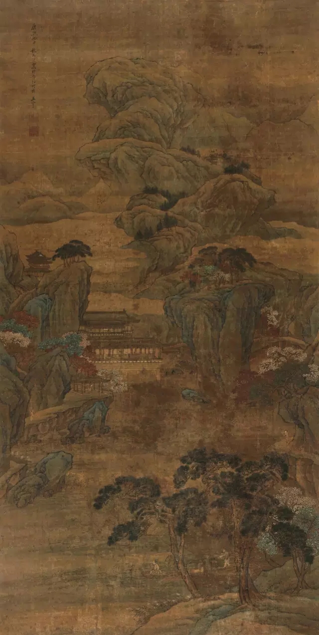 清初,袁江將長期受到文人畫家冷落的“北派”山水傳統,結合怪奇的晚明山水,重續(xù)宋時“界畫”的傳統工匠主義,創(chuàng)繪細膩卻強有力的山水樓閣,置于錯亂時空的奇幻風格。袁江,字文濤,晚號岫泉,江蘇江都(揚州)人。雍正年間供奉內廷。喜作絹本大幅,表現具有漢唐宮苑故事性的宏偉建筑。如天津博物館藏《沉香亭》,描繪唐玄宗與楊玉環(huán)游賞宴樂景。此幅《秋月》,圖中女子服飾皆有漢時樣,應為描繪“漢宮秋月”,宮女寂寥清冷的生命意境。幾絲傷意,豈止今夕,九月十三。此幀絹本立軸,款書“桂林秋月”,袁江晚年界畫代表作品之一。近景坡頂復廊,墻上漏窗置瓶花、香爐,連接左側被巨石及卷簾遮蔽的前廊。沿雕鏤的白色大理石臺基,至拱頂側殿,一巨型野逸山水屏風,卷頭案以佛手、瓶花、香爐、銅鏡供奉。一組女子奏樂于殿外回廊,廊上多掛燈籠,即為中秋夜擊鼓奏樂,祭月迎寒演練的場面。中景繪重檐樓閣,觀漓江秋瀾,眺訾洲煙雨,女子結伴談笑,唱和依稀帝女蕭。全幅不見一男子,左側女子登危樓覽興,扶倚欄桿,極目韶光好景饒,身若隨云覓月去,飄然思不窮,蕭蕭月下愁相離。遠景獨秀群山環(huán)榻峙,一排屋舍暮靄藏,秋月高懸云霧間。