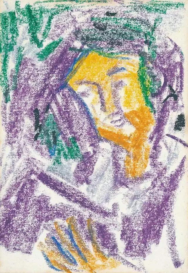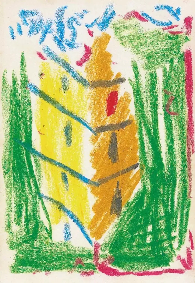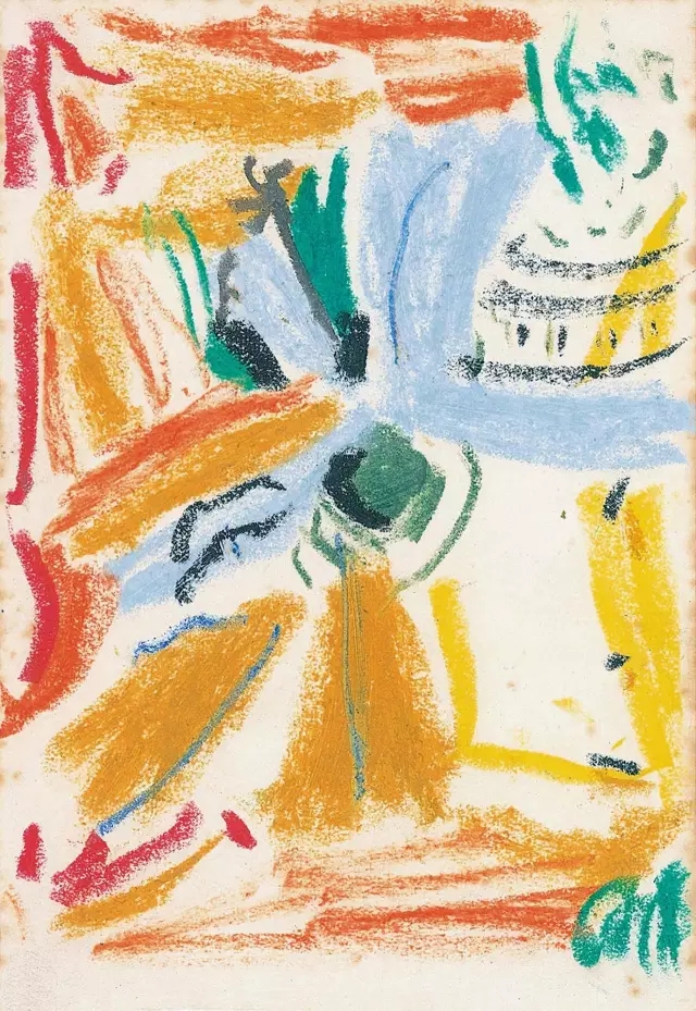 吳大羽幾乎不給畫作命名,他曾經(jīng)說過要讓畫面自身去表達(dá),命名就成為了多馀。而蠟筆畫更甚,是藝術(shù)家晚年在藝術(shù)領(lǐng)悟通達(dá)之后,肆意涂鴉式的創(chuàng)作,從形式上看又可以分為抽象與半抽象兩種類型。半抽象的畫作在吳大羽的藝術(shù)創(chuàng)作中,雖然稀有卻極為重要。作品畫面看似凌亂的涂鴉,在長短、粗細(xì)、曲直、擴(kuò)散、交疊的書寫線條下,呈現(xiàn)出半抽象的形式。