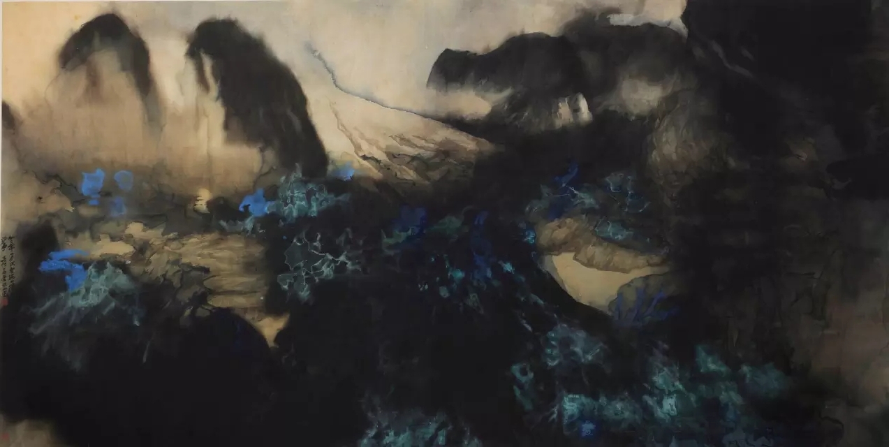 張大千利用墨彩自身溶與不溶于水的關(guān)系和效果,施行渲染、重疊、潑灑、沉漬、流動(dòng),營(yíng)造出了千姿百態(tài)的煙云效果、山勢(shì)氣韻,使得那如真似幻的抽象造型與大自然的山嵐云霧、云水飛動(dòng)的具體形象完美有機(jī)地結(jié)合在一起,將大自然神奇幽深、明滅顯晦的景致通過亮麗的色彩挪移到有限的畫面之上,有著陰明晴晦自然鏡像的萬千變化,使山水畫厚重深沉,浪漫奔放、大氣磅礴、變幻無窮、蒼渾雄深、色彩濃艷深邃、美如勝境,源于自然而又高于自然。