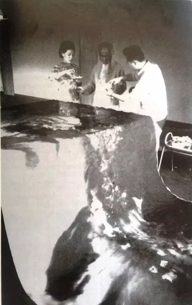 此幅畫絹之寬173公分,遠(yuǎn)超過一般畫絹之制作,而近于其晚年絕筆《廬山圖》之178公分。所在制作大幅作品時(shí),其艱困及體力、物力之消耗,遠(yuǎn)勝一般小畫,所幸大千在日本及巴西時(shí)期的友人王之一先生,拍攝了大千在八德園中大畫室創(chuàng)作此畫過程的照片,讓我們有機(jī)會(huì)一瞥大千創(chuàng)作此圖時(shí)的艱辛。