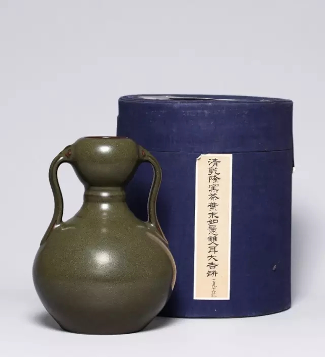 如意耳尊是清雍正、乾隆時期官窯流行的尊式之一,因裝有如意形耳而得名。這件拍品造型十分獨特,此類如意耳葫蘆尊本于乾隆一朝燒造很少,館藏與市場流通中可見的以平底葫蘆瓶居多,但如本品這樣的臥足葫蘆尊在流通中僅此一例。拍品原是仇焱之“抗希齋”的舊藏之物,胡惠春于20世紀30-40年代購于上海,后于2005年參加由上海博物館、首都博物館與香港中文大學文物館舉辦的“暫得樓清代官窯單色釉瓷器”。