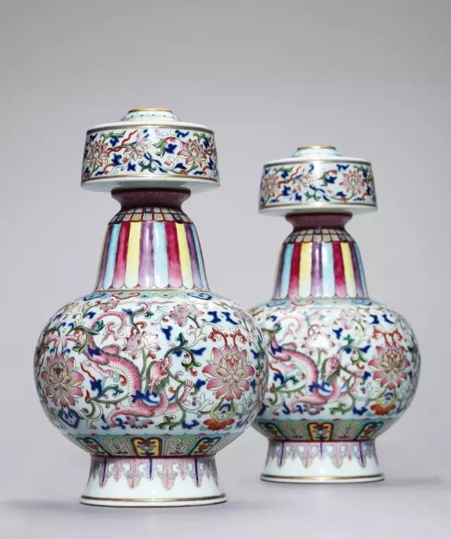 清乾隆 御制洋彩夔龍蓮花賁巴瓶一對