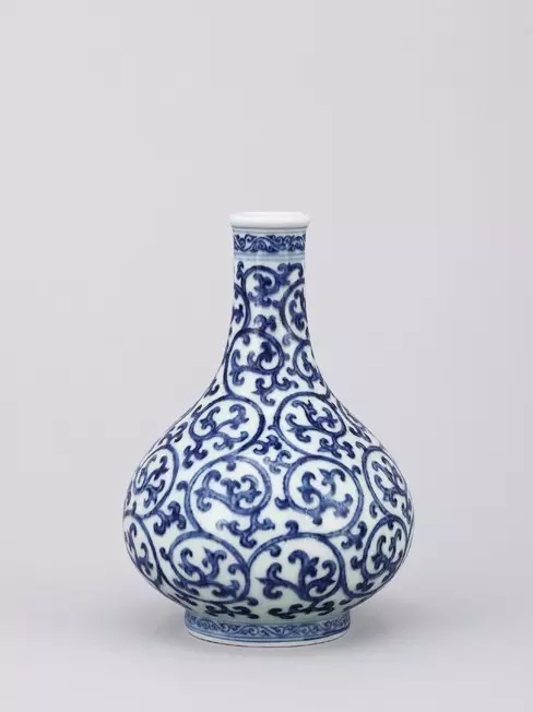 抱月瓶器形是乾隆時期在永樂青花大扁瓶的基礎(chǔ)上加以改制,而創(chuàng)造出的新器型,并成為宮廷的重要陳設。這件拍品集模印、貼塑、繪畫于一身,是難得的官窯陳設重器,且尺寸較大,燒造不易,能夠流傳至今十分難得。抱月瓶的發(fā)色艷麗,呈現(xiàn)出乾隆成熟期的特征,器口與器足的裝飾紋樣體現(xiàn)出清代裝飾風格。瓶身主體繪“八吉祥”紋,蘊含佛教教義,體現(xiàn)了宮廷信仰。